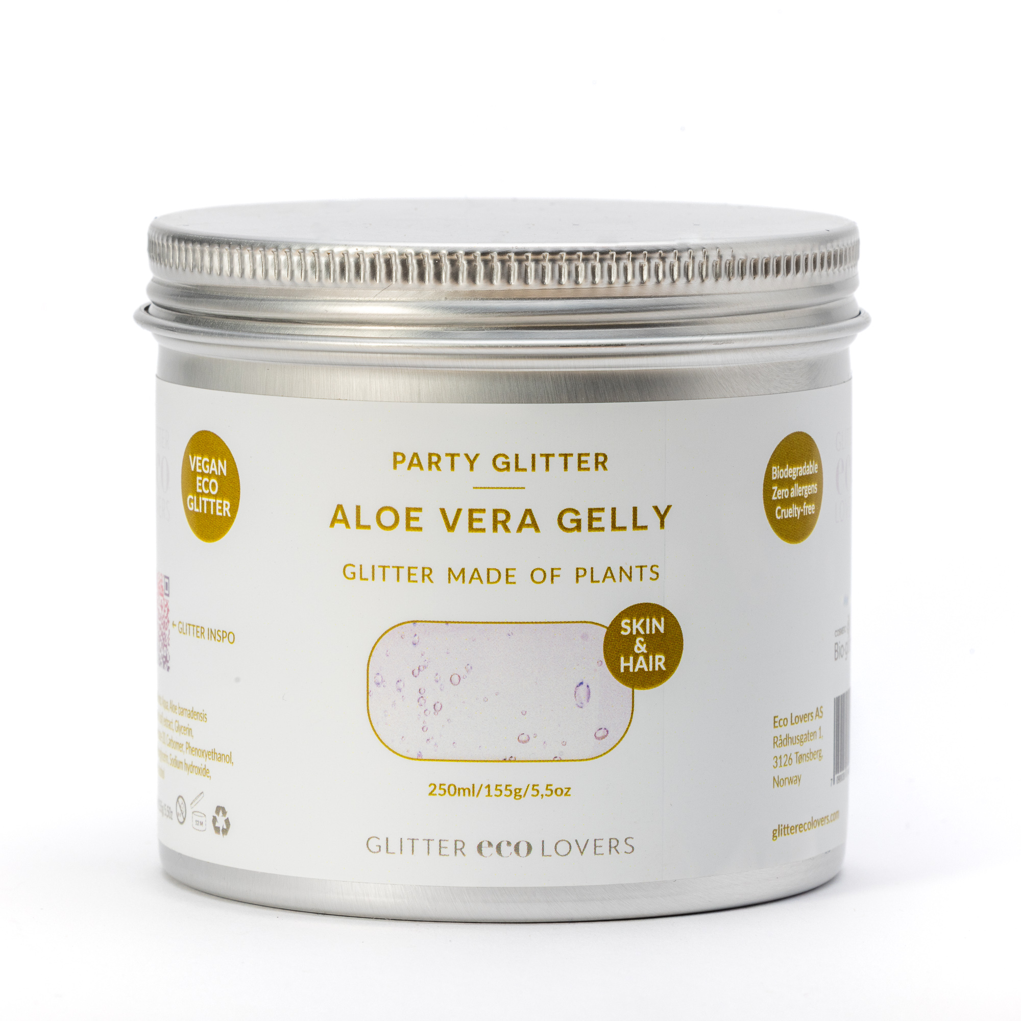 Aloe Vera Gelly brukes til å feste/lime det løse glitteret til hud eller hår. Smør på et tynt lag med gele og dabb deretter på glitteret. La tørke i noen sekunder og glitteret vil sitte godt på huden/håret i lang tid. For å fjerne det kan du enkelt vaske bort med litt vann. Gele’en er laget av økologisk dyrkede aloe vera planter og er også fuktgivende for huden. Alle våre produkter er vegan, ikke testet på dyr og inneholder ingen allergener.