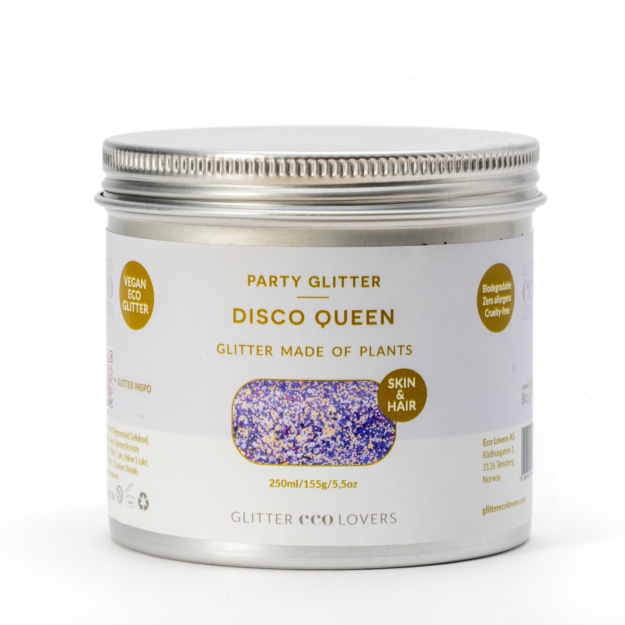 Disco Queen er et edgy party glitteret som består av lilla, rosa, gull og et hint av sølv. Perfekt pynt til dere som alltid er klar for en fest. Fest det løse glitteret med Glitter Eco Lovers økologiske Aloe Vera Gelly som fungerer som et naturlig lim. Annen aloe vera gele som ikke er utvannet fungerer også, eventuelt kan du bruke vaselin eller leppebalm.