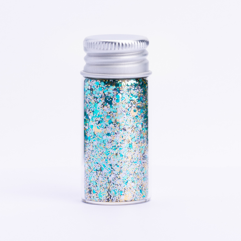 Fairy Dust glitteret er en mix av turkis med et hint av gull og sølv glitter i hexagon fasong. Perfekt pynt til deg som liker en sart og clean look. Fest det løse glitteret med Glitter Eco Lovers økologiske Aloe Vera Gelly som fungerer som et naturlig lim. Annen aloe vera gele som ikke er utvannet fungerer også, eventuelt kan du bruke vaselin eller leppebalm.