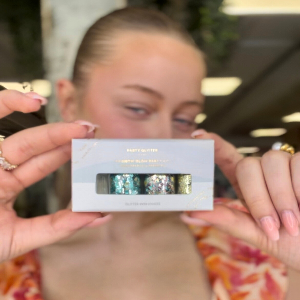 Rainbow Glow Party Kit er et praktisk sett som består av 3 glittermixer: Rainbow Glow i alle regnbuens farger, Gold og Fairy Dust. Du får også med økologisk aloe vera gele til å feste/lime glitteret på hud eller i hår, samt en liten makeup kost. Påfør litt aloe vera på huden og dabb så deretter på glitter, og du er klar for en fest i en fei!